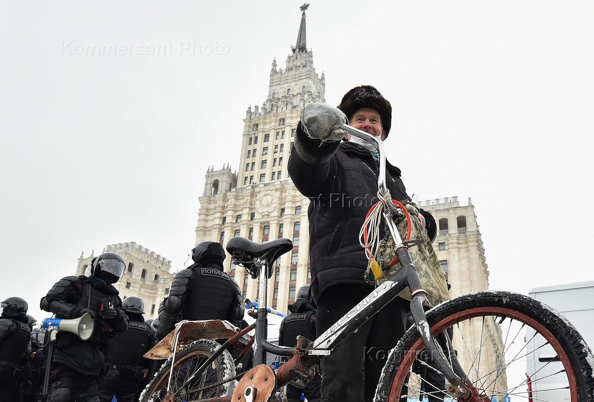 Несогласованная акция в поддержку оппозиционера Алексея Навального. Жанровая фотография. Курьер службы доставки "Самокат" на велосипеде на улице города.