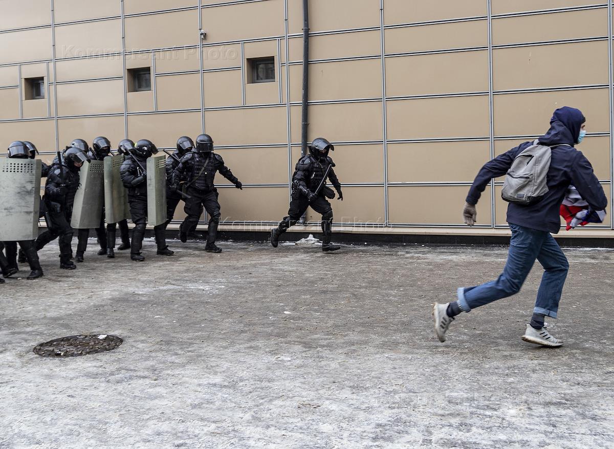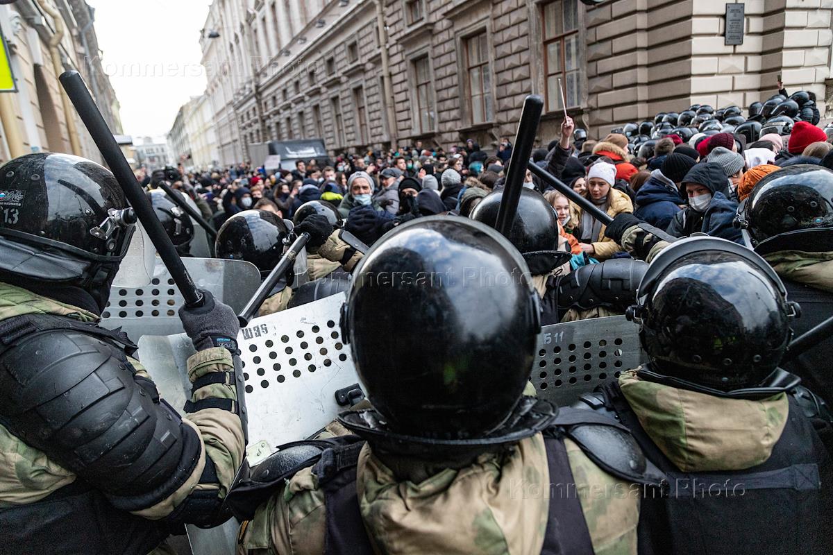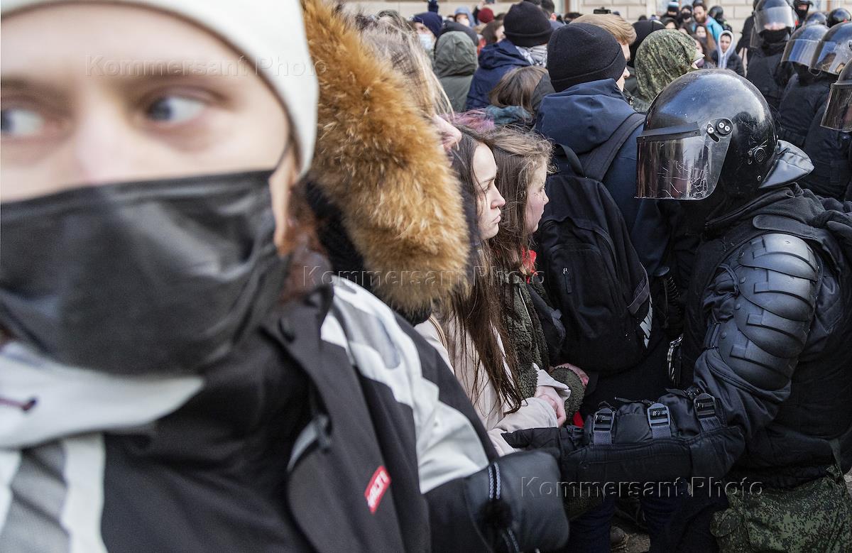 Несогласованная акция сторонников оппозиционера Алексея Навального в Санкт-Петербурге. Сотрудники полиции в оцеплении и участники во время акции.