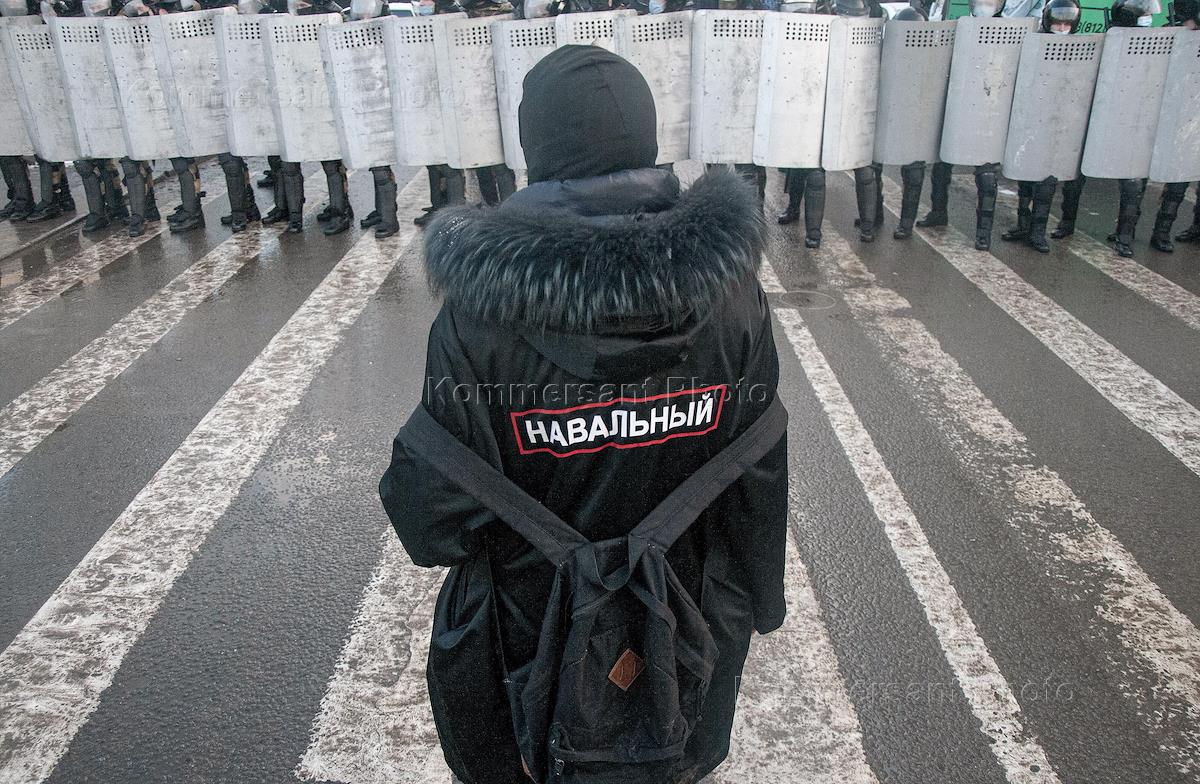 Unauthorized rally in support of opposition leader Alexei Navalny in St. Petersburg. A girl in a jacket with the inscription "Navalny" in front of police officers in a cordon.