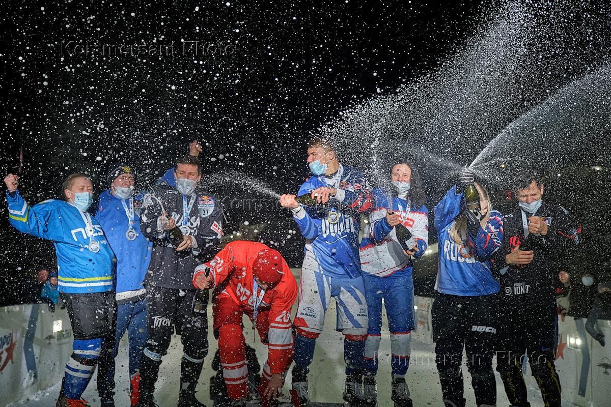 Этап чемпионата мира по скоростному спуску на коньках Ice Cross на треке всесезонного курорта "Игора". Первая гонка в сезоне 2020/2021 Red Bull Ice Cross. Победители соревнований во время церемонии награждения.