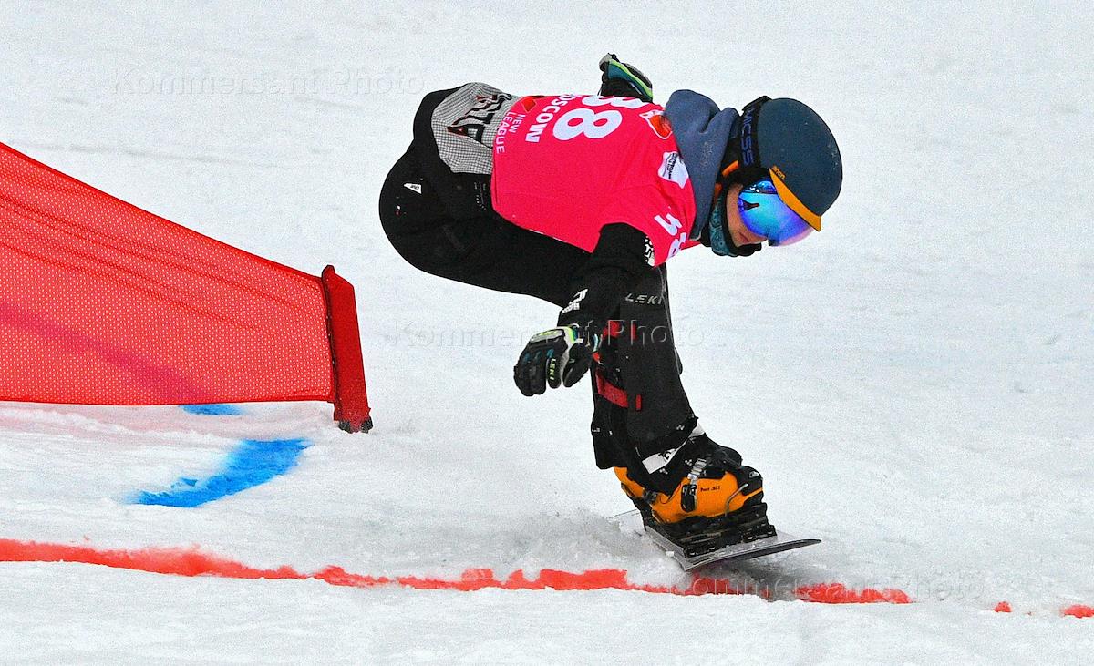 FIS Snowboard World Cup in parallel slalom at the Vorobyovy Gory sports complex. Service employee during the preparation of the route.