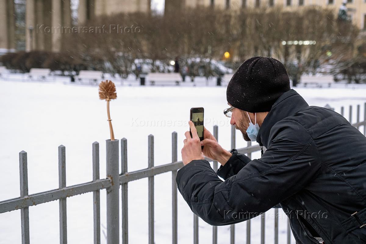 Genre photography. A man photographs a brush on the fence of the Kazan Cathedral square.