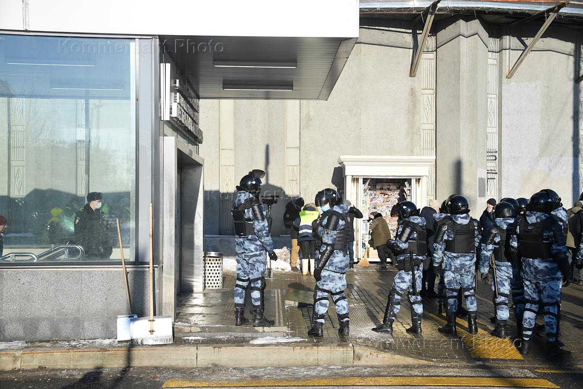 Court hearing of Alexei Navalny's case of substitution of conditional sentence in the form of 3.5 years of custody for a real term of imprisonment in the framework of the Yves Rocher criminal case at the Moscow City Court. Police officers are cordoned off at the Preobrazhenskaya Ploshchad metro station where a rally in support of Alexei Navalny is expected.