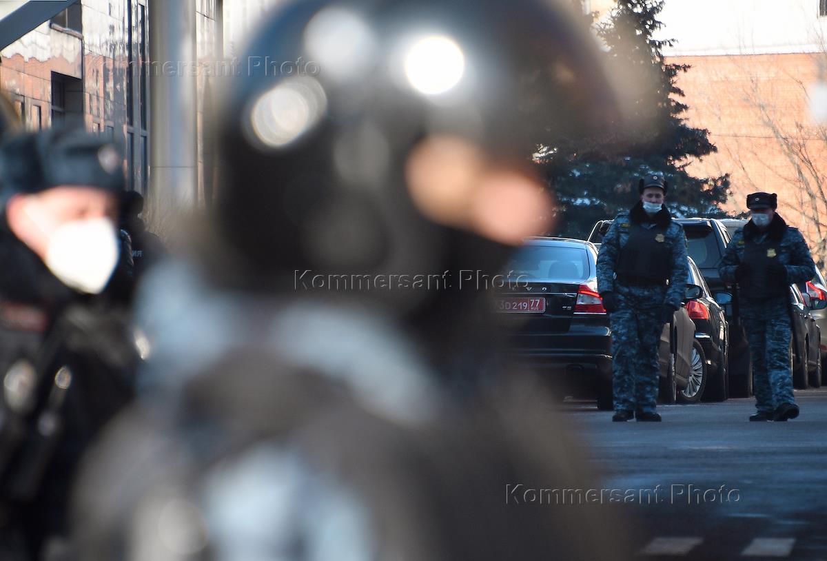 Court hearing of Alexei Navalny's case of substitution of conditional sentence in the form of 3.5 years of custody for a real term of imprisonment in the framework of the Yves Rocher criminal case at the Moscow City Court. Situation outside the courthouse. Police officers outside the courthouse.