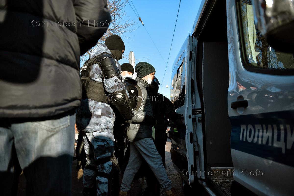 Court hearing of Alexei Navalny's case of substitution of conditional sentence in the form of 3.5 years of custody for a real term of imprisonment in the framework of the Yves Rocher criminal case at the Moscow City Court. Situation outside the courthouse. Police officers while arresting participants of a rally in support of Alexei Navalny.