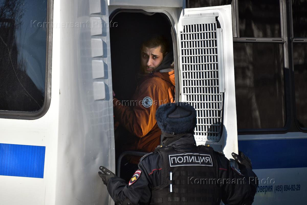 Рассмотрение вопроса замены наказания оппозиционеру Алексею Навальному в виде 3,5 года лишения свободы условно на реальный срок заключения в рамках уголовного дела "Ив Роше" в Московского городского суда. Ситуация у здания суда. Сотрудники полиции во время задержания участников акции в поддержку Алексея Навального.