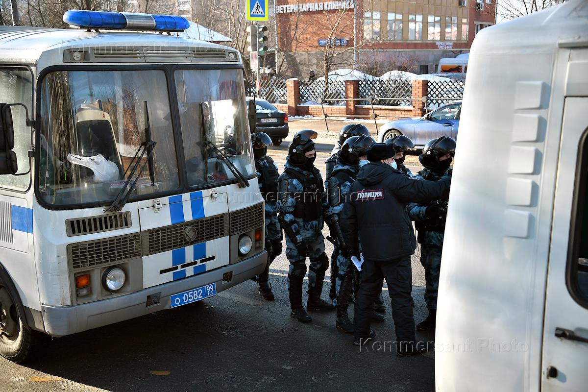 Court hearing of Alexei Navalny's case of substitution of conditional sentence in the form of 3.5 years of custody for a real term of imprisonment in the framework of the Yves Rocher criminal case at the Moscow City Court. Situation outside the courthouse. Police officers while arresting participants of a rally in support of Alexei Navalny.