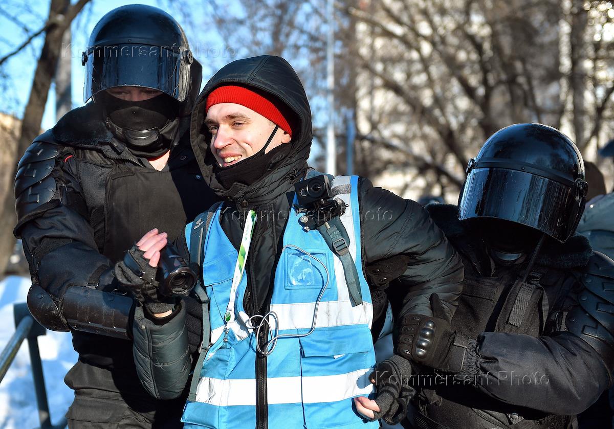 Рассмотрение вопроса замены наказания оппозиционеру Алексею Навальному в виде 3,5 года лишения свободы условно на реальный срок заключения в рамках уголовного дела "Ив Роше" в Московского городского суда. Ситуация у здания суда. Сотрудники полиции во время задержания участников акции в поддержку Алексея Навального.