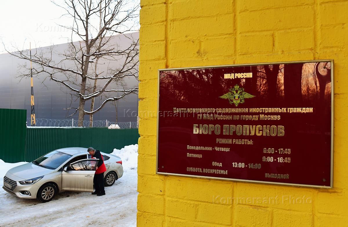 GBU Multifunctional Migration Center (special detention center for migrants) in the village of Sakharovo in the Troitsky Administrative District, where the detained participants of the unauthorised rally on January 31, 2021 in support of politician Alexei Navalny in the center of Moscow were taken. The sign "Bureau of passes" on the building of the special detention center.