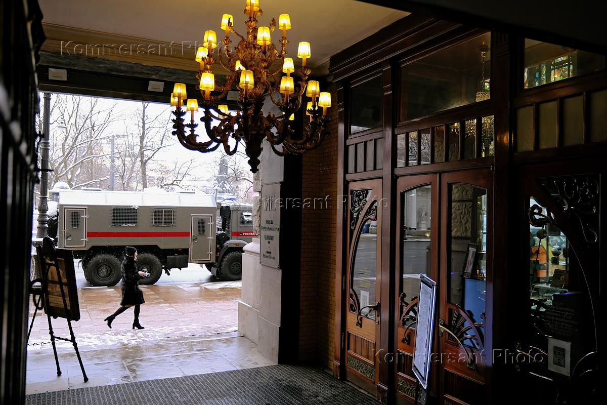 Court hearing of Alexei Navalny's case of substitution of conditional sentence in the form of 3.5 years of custody for a real term of imprisonment in the framework of the Yves Rocher criminal case at the Moscow City Court. Police officers and a car near Gostiny Dvor.