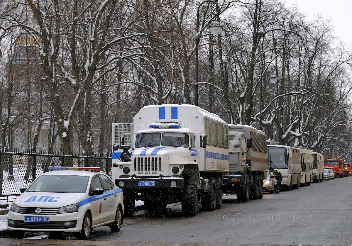 Court hearing of Alexei Navalny's case of substitution of conditional sentence in the form of 3.5 years of custody for a real term of imprisonment in the framework of the Yves Rocher criminal case at the Moscow City Court. Police cars on Nevsky Prospekt.