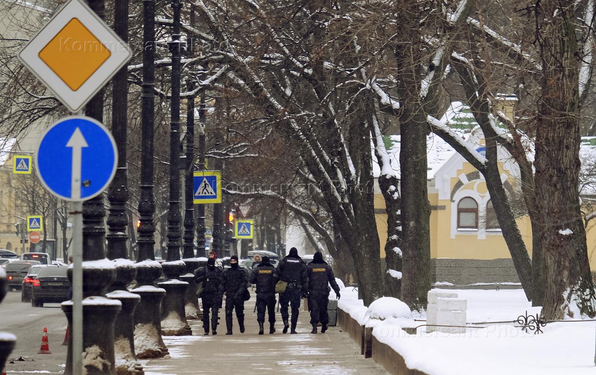 Court hearing of Alexei Navalny's case of substitution of conditional sentence in the form of 3.5 years of custody for a real term of imprisonment in the framework of the Yves Rocher criminal case at the Moscow City Court. Police cars on Nevsky Prospekt.