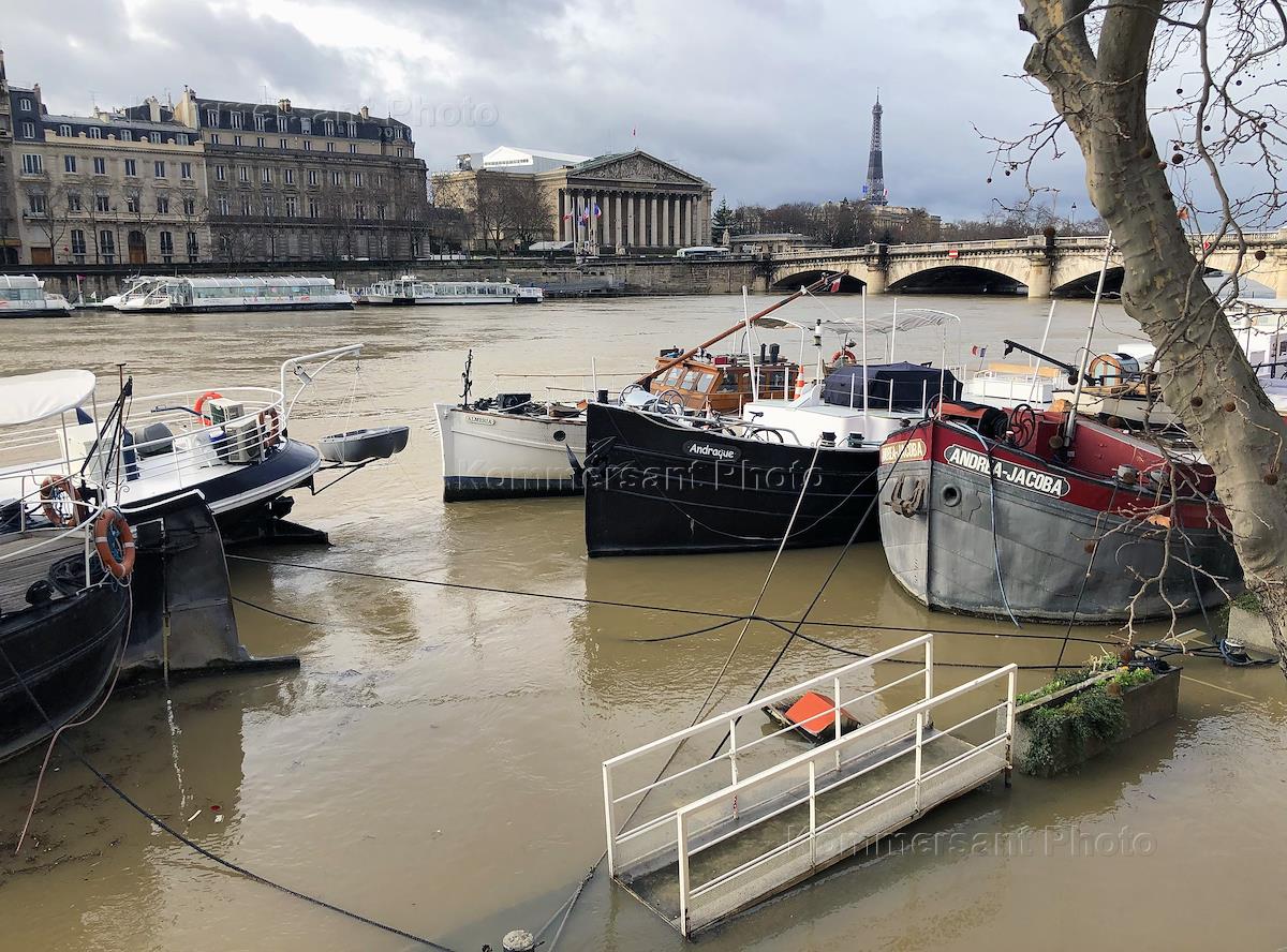 Flooding in Paris. Genre photography. The Seine River spills in the Ile-de-France metropolitan area. Flooded embankment.