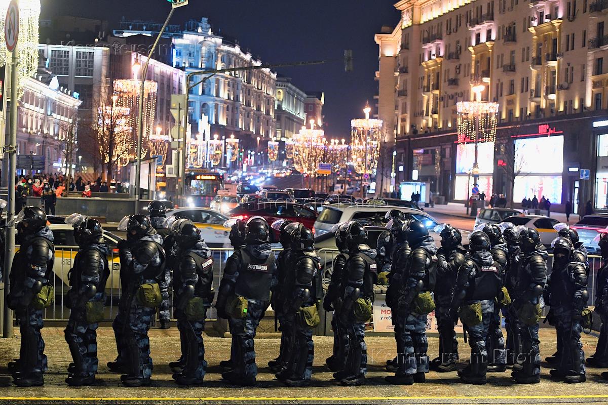 A rally in support of the politician Alexei Navalny, announced by Navalny's headquarters in connection with the verdict of the Moscow City Court to substitute Alexey Navalny's suspended sentence with a real one. Police officers cordon off the street during the rally.