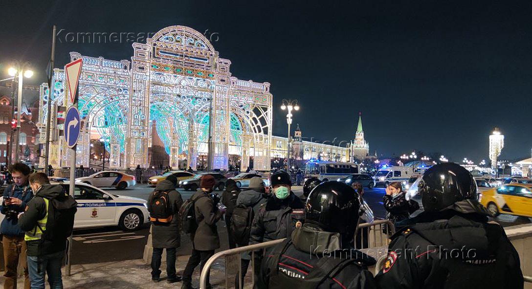 rally in support of the politician Alexei Navalny, announced by Navalny's headquarters in connection with the verdict of the Moscow City Court to substitute Alexey Navalny's suspended sentence with a real one. Police officers at Manezhnaya Square.