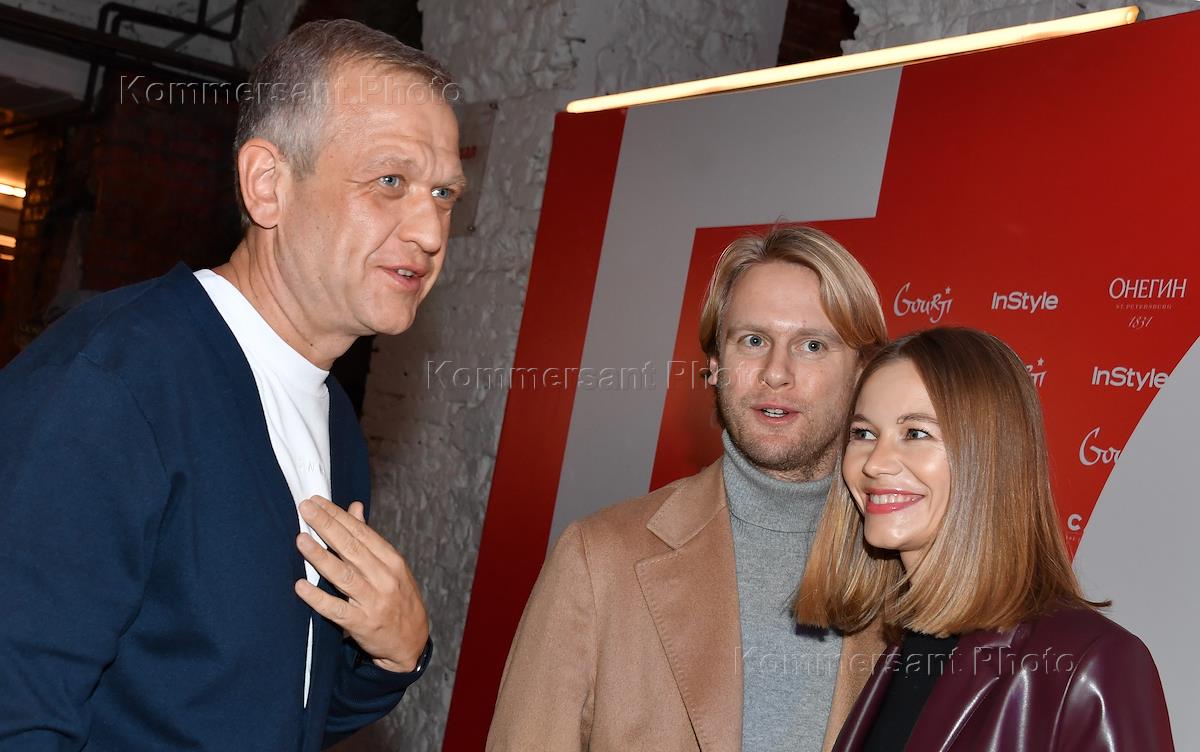 Celebrating the 8th anniversary of the "Gogol Center". Left to right: Sergei Kapkov, head of the Center for Research on the Economics of Culture, Urban Development and Creative Industries, Faculty of Economics, Lomonosov Moscow State University (MSU), producer Ilya Stewart and actress Svetlana Ustinova at the event.