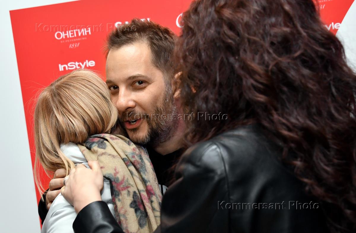 Celebrating the 8th anniversary of the "Gogol Center". Left to right: actress Yulia Aug, musician Roman Bilyk (Roma Zver) with his wife Marina Koroleva at the event.