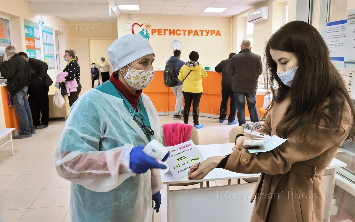 Вакцинация населения от коронавирусной инфекции COVID-19 препаратом "Гам-КОВИД-Вак" ("Спутник V"). Медицинский работник во время измерения температуры пациентам перед прививкой.