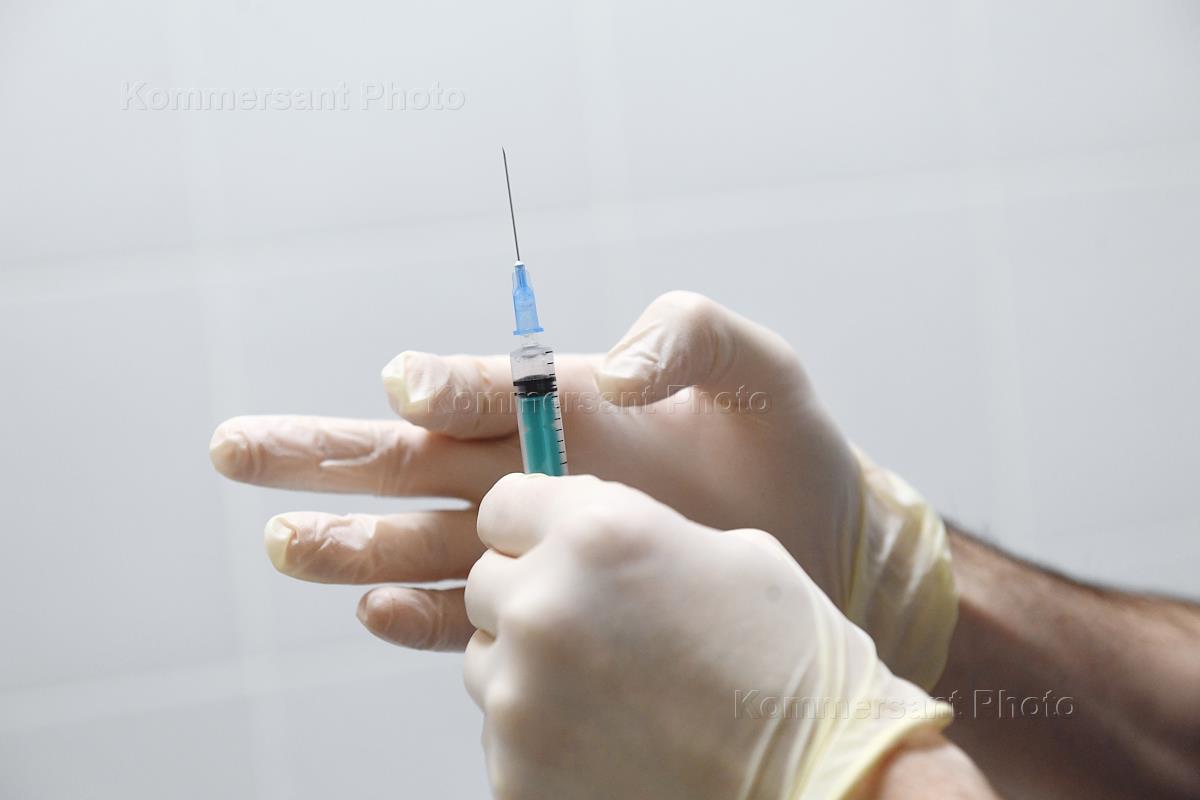 Центр вакцинации от коронавирусной инфекции COVID-19 на территории флагманского офиса "Мои документы" в Торгово-развлекательном центре (ТРЦ) Columbus. Жанровая фотография. Руки в медицинских перчатках со шприцем с лекарством.