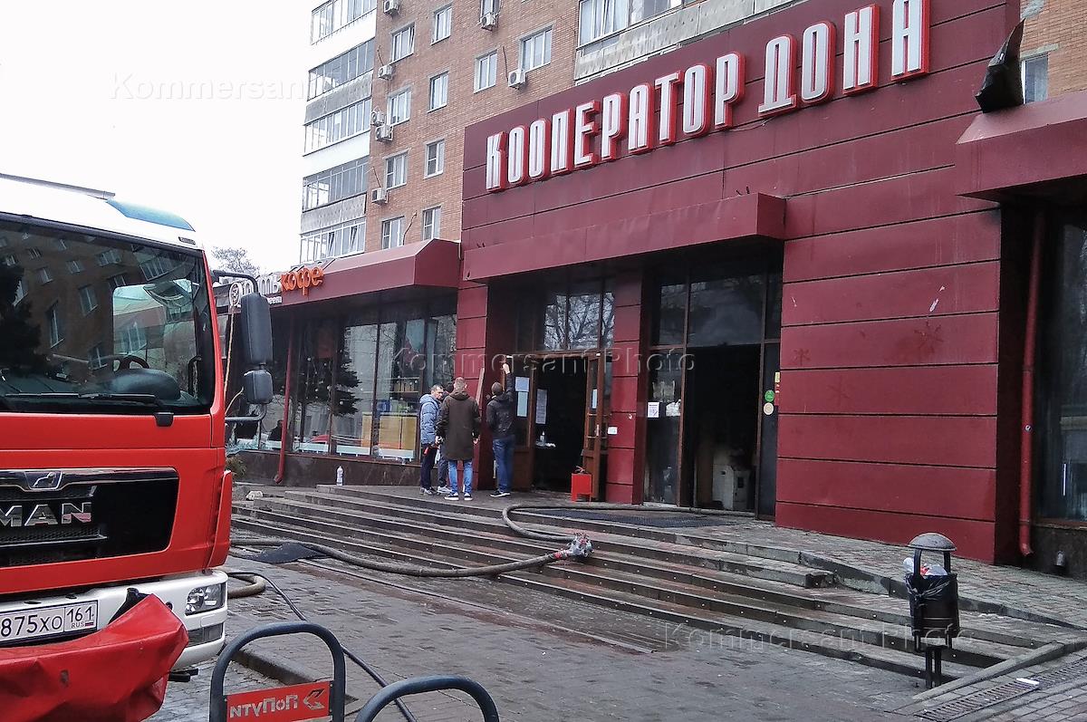Consequences of a fire in the "Kooperator Don" store. The car of the fire service of the Ministry of Emergency Situations at the scene of the fire.