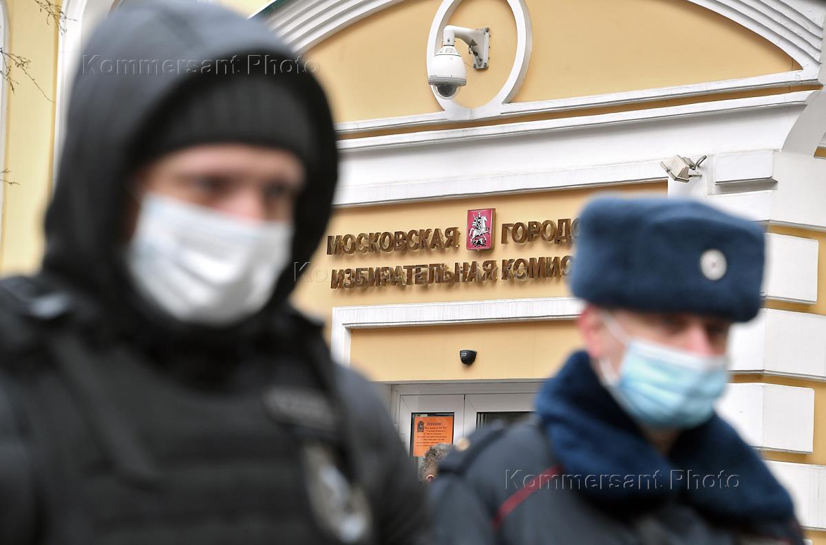 Акция "За честные и чистые выборы" прошла у здания Московской городской избирательной комиссии (Мосгоризбирком). Сотрудники полиции во время акции.