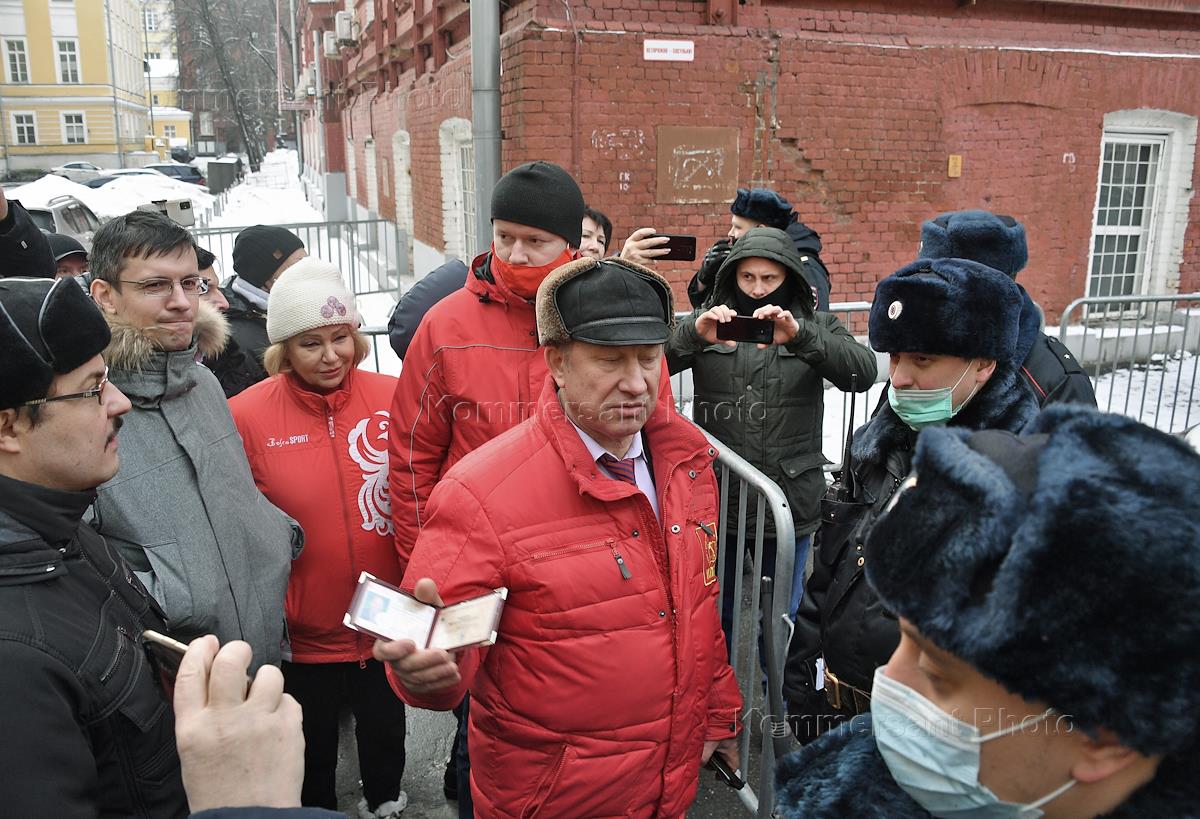 Акция "За честные и чистые выборы" прошла у здания Московской городской избирательной комиссии (Мосгоризбирком). Первый заместитель председателя комитета Государственной думы (ГД) России по делам национальностей Валерий Рашкин (в центре) и член комитета ГД России по федеративному устройству и вопросам местного самоуправления Денис Парфенов (справа) во время акции.