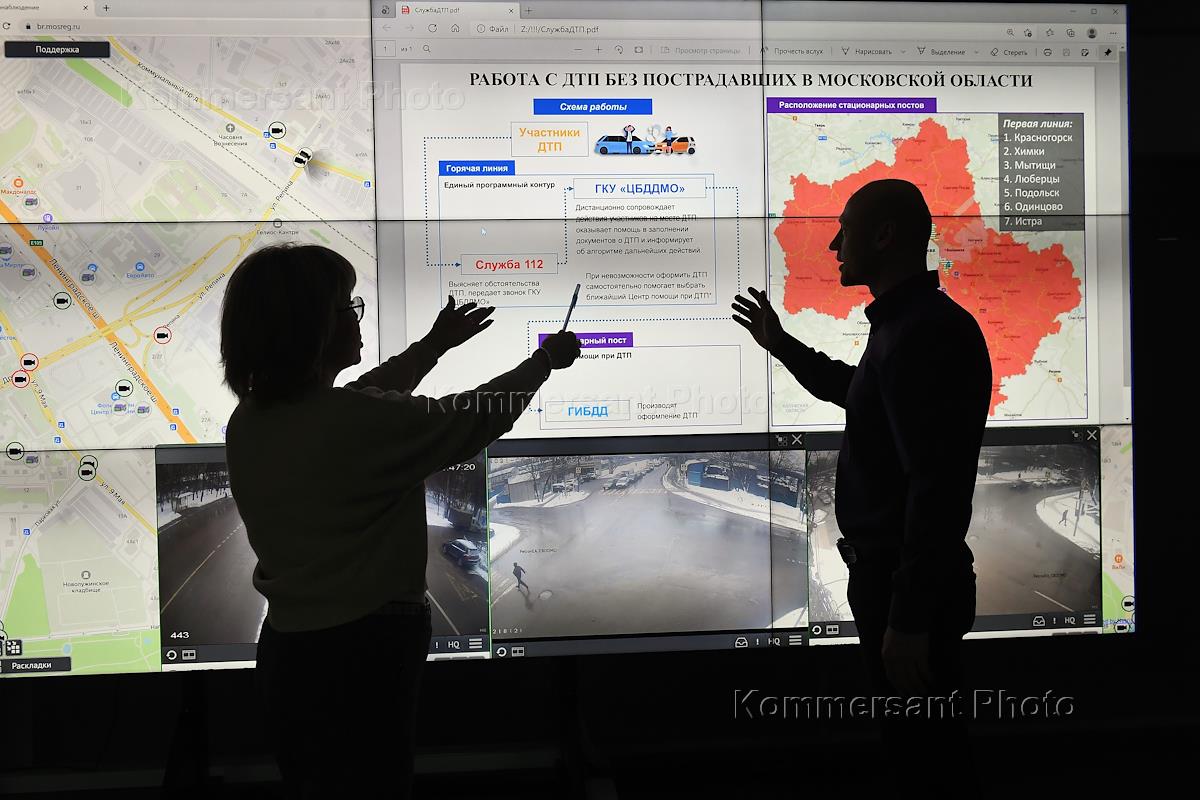 Колл-центр системы быстрого реагирования на пробки и дорожно-транспортные происшествия (ДТП). Сотрудники Центра безопасности дорожного движения Московской области (ЦБДДМО) во время работы.