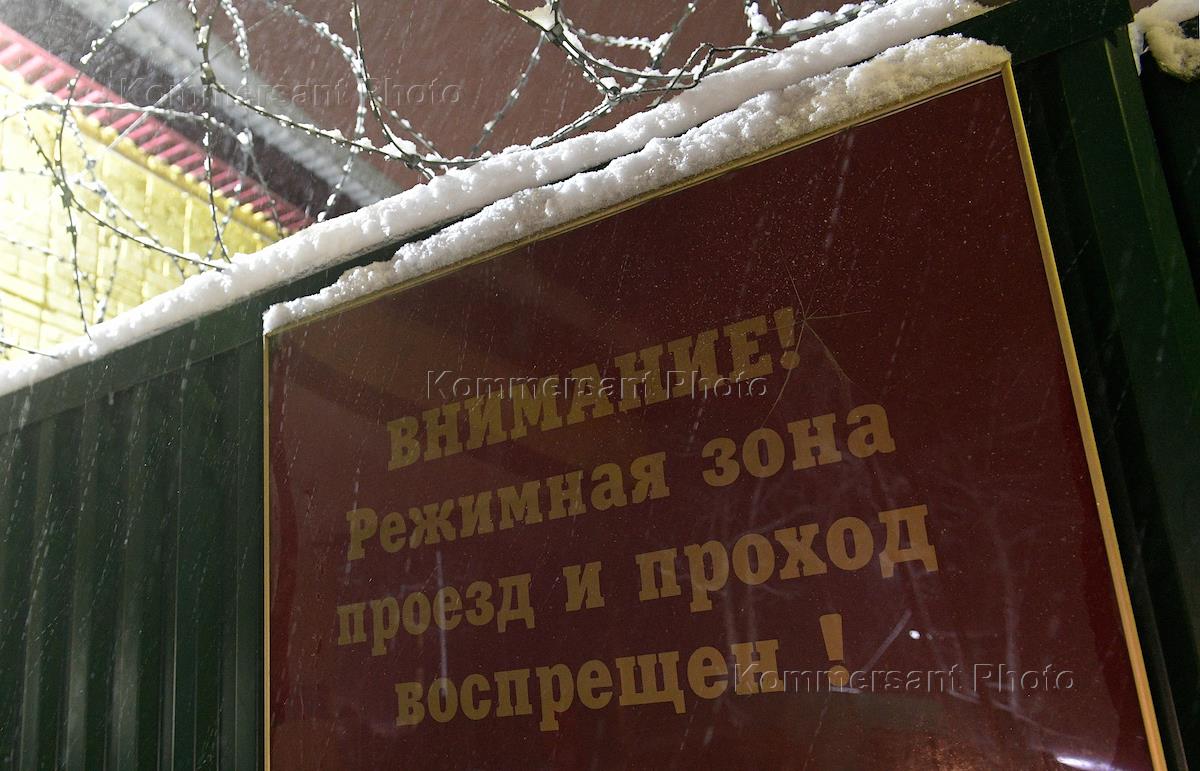 ГБУ Многофункциональный миграционный центр (спецприемник для мигрантов) в деревне Сахарово в Троицком административном округе. Жанровая фотография. Табличка на заборе центра: "Внимание! Режимная зона. Проезд и проход воспрещен!"
