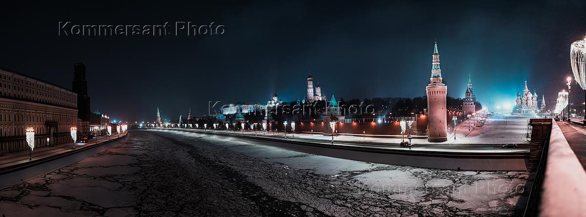 Views of Moscow in winter. Panorama of the Moscow Kremlin from the Bolshoi Moskvoretsky Bridge. Ice on the Moskva River.
