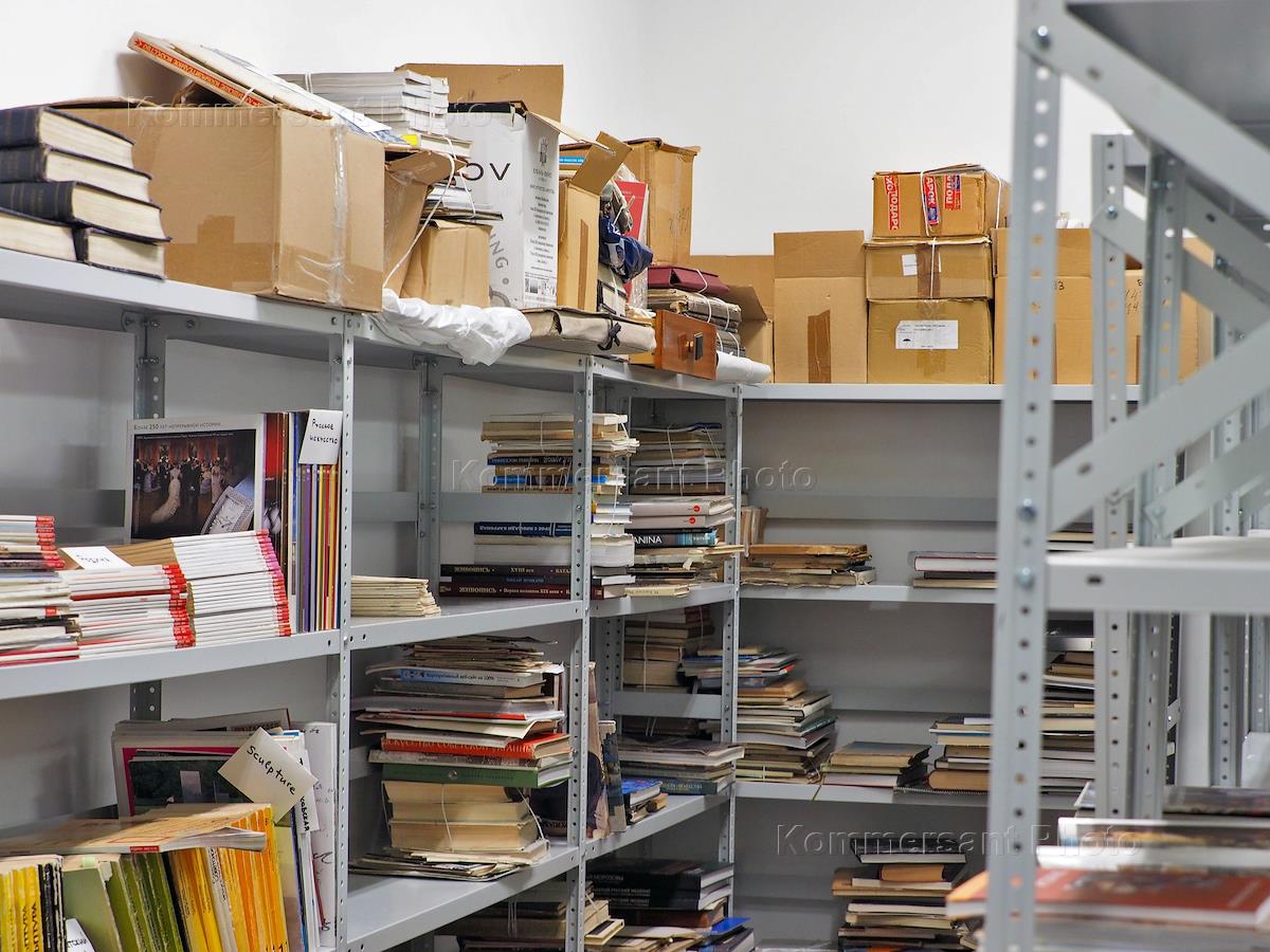 Repository of the Hermitage-Ural Cultural and Educational Center. Stacks of books on the shelves of the storage facility.