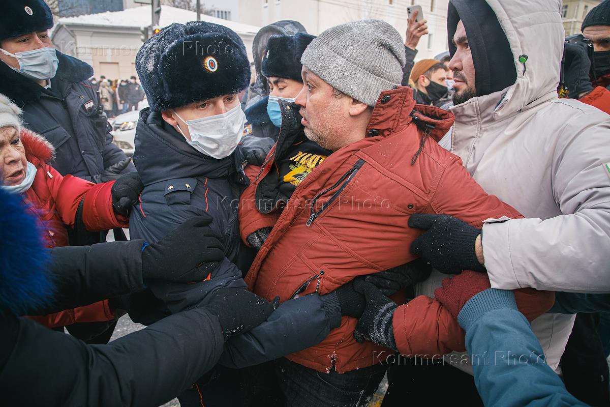 Несогласованная акция в поддержку оппозиционера Алексея Навального на площади имени Салавата Юлаева. Сотрудники полиции во время задержания участников акции.