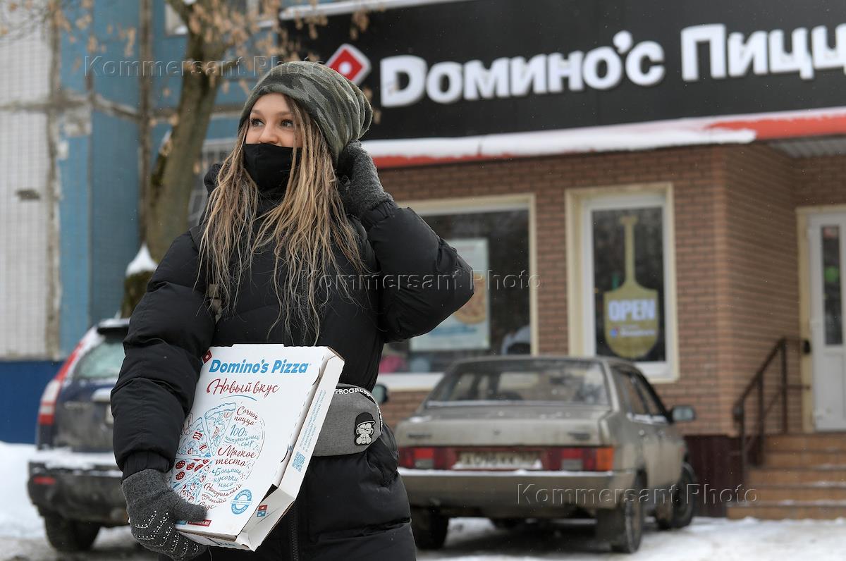 Сеть пиццерий Domino's Pizza (Доминос Пицца). Жанровая фотография. Прохожие в медицинских масках возле витрины пиццерии.