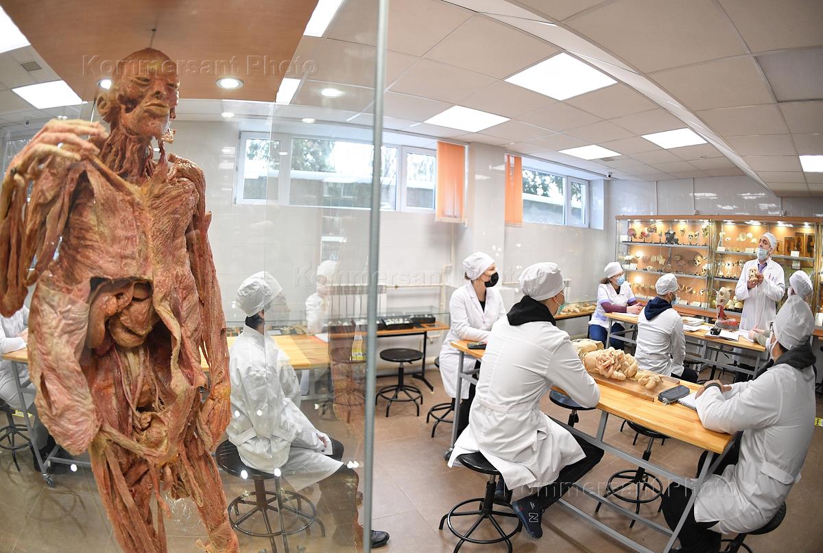 Возвращение студентов Российского университета дружбы народов (РУДН) к очному обучению. РУДН вернулся к очному формату обучения после ослабления ограничений, связанных с пандемией коронавирусной инфекции COVID-19. Жанровая фотография. Студенты Медицинского института РУДН во время занятий.