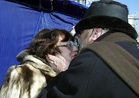 Правозащитник Валерия Новодворская (слева) и журналист Андрей Черкизов (справа) на митинге в защиту свободы прессы, телеканала "НТВ" и холдинга "Медиа-Мост", прошедшем на Пушкинской площади.