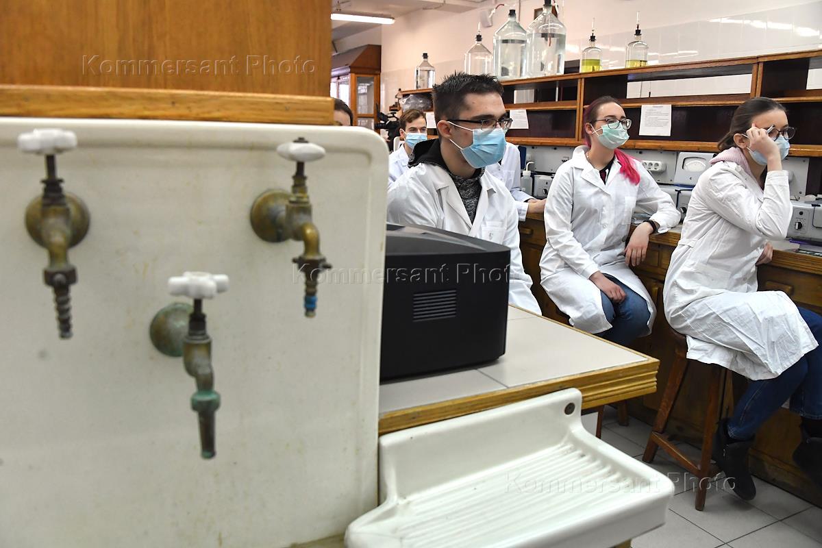Students of the Lomonosov Moscow State University (MSU) returned to full-time education. Moscow State University returned to full-time education after mitigating restrictions associated due to COVID-19 pandemic. Genre photography. Students during classes in laboratory classes.