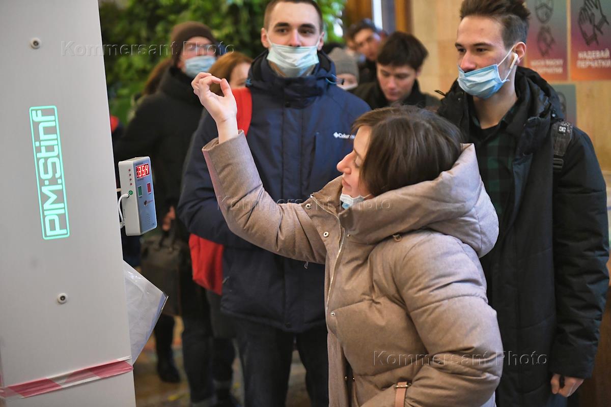 Students of the Lomonosov Moscow State University (MSU) returned to full-time education. Moscow State University returned to full-time education after mitigating restrictions associated due to COVID-19 pandemic. Genre photography. Students measure the temperature at the entrance to the university.