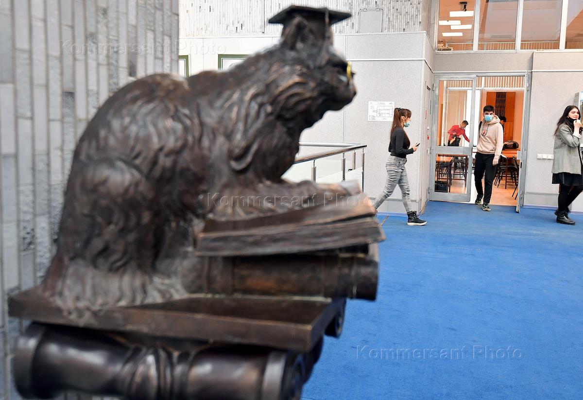 Students of the Peoples' Friendship University of Russia (RUDN) returned to full-time education. RUDN University returned to full-time education after mitigating restrictions due to COVID-19 pandemic. Genre photography. The sculpture "Cat scientist" in the lobby of the university.