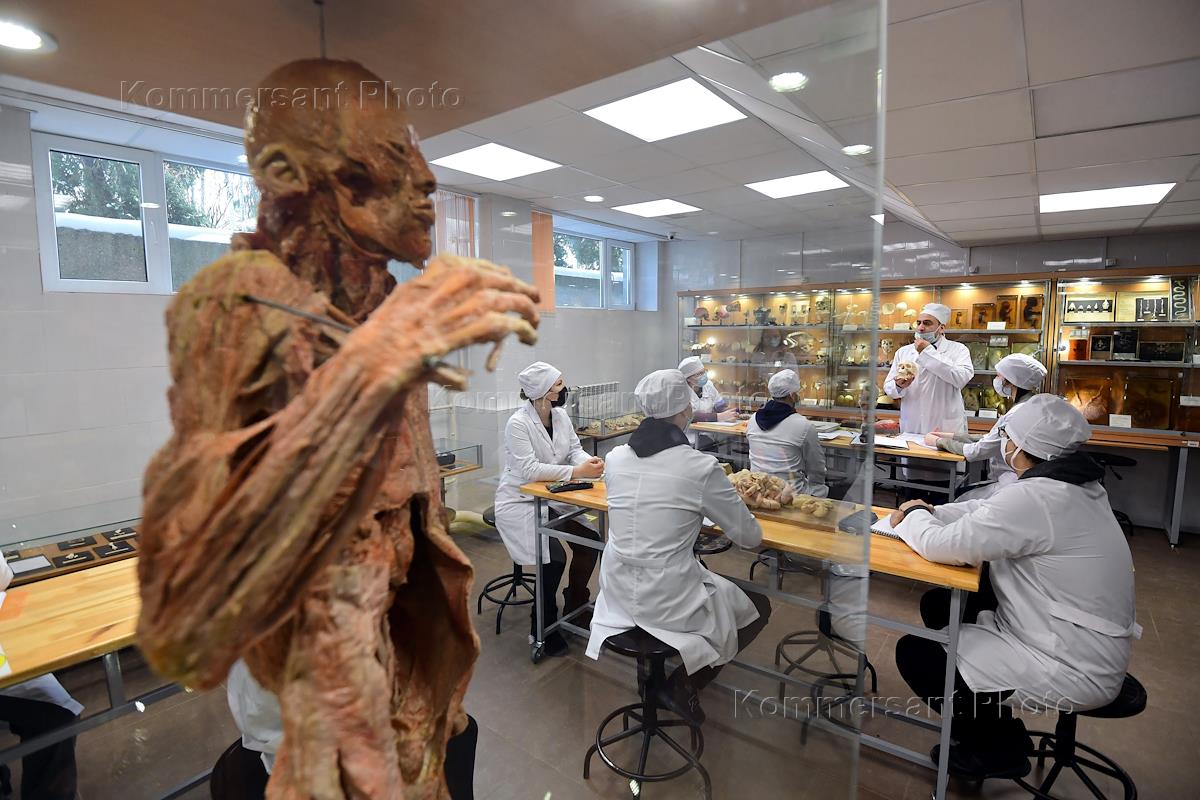 Students of the Peoples' Friendship University of Russia (RUDN) returned to full-time education. RUDN University returned to full-time education after mitigating restrictions due to COVID-19 pandemic. Genre photography. Students and teachers of the RUDN Medical Institute during classes.