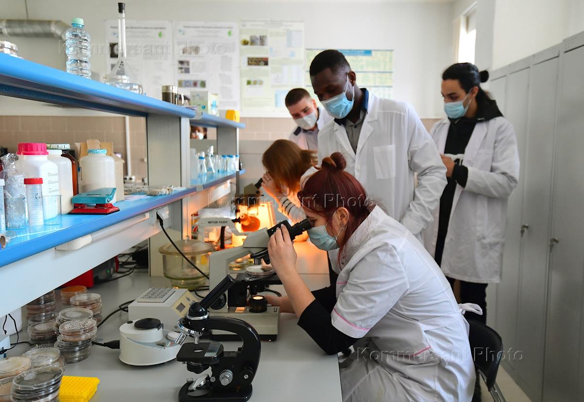 Students of the Peoples' Friendship University of Russia (RUDN) returned to full-time education. RUDN University returned to full-time education after mitigating restrictions due to COVID-19 pandemic. Genre photography. Students of the RUDN Medical Institute in the laboratory during classes.