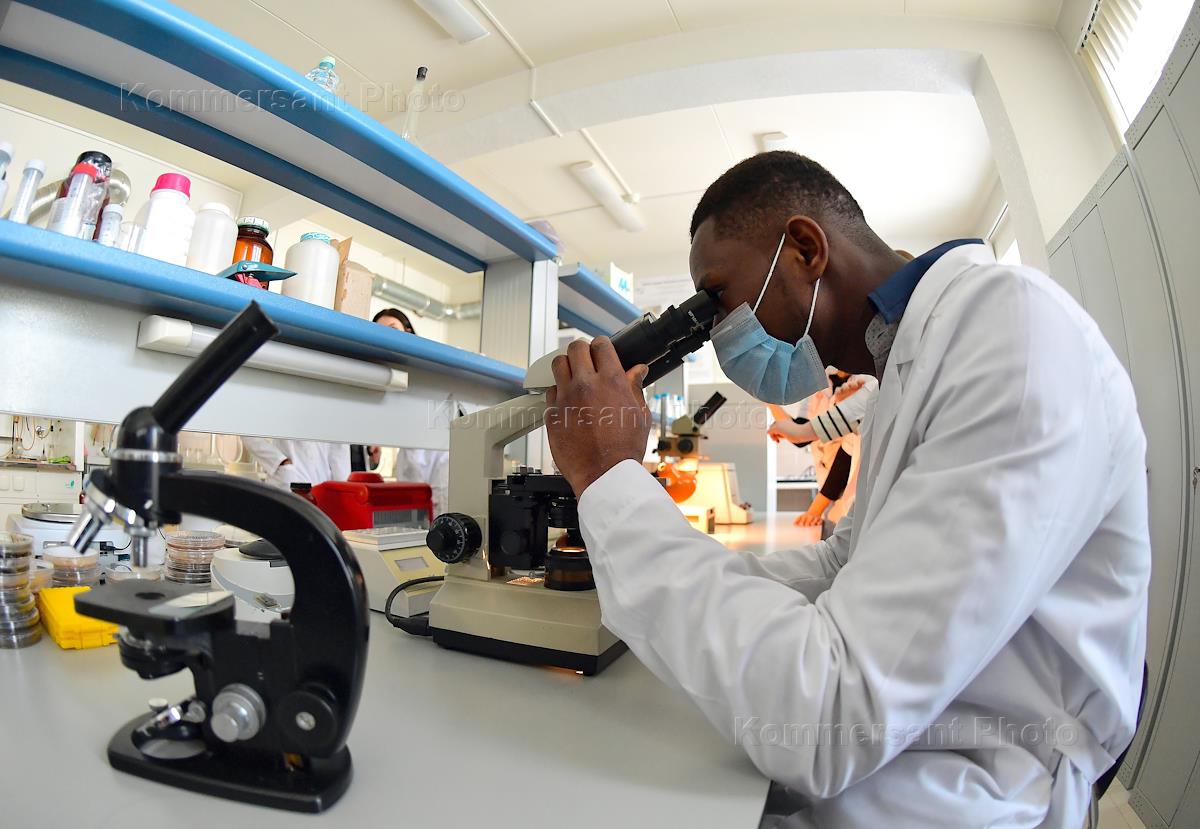 Students of the Peoples' Friendship University of Russia (RUDN) returned to full-time education. RUDN University returned to full-time education after mitigating restrictions due to COVID-19 pandemic. Genre photography. Students of the RUDN Medical Institute in the laboratory during classes.