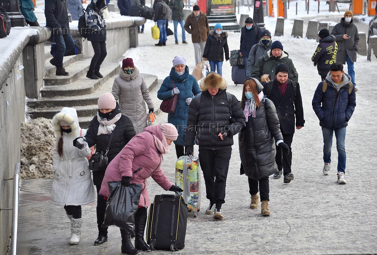 Views of Moscow. Genre photography. Passengers with luggage on the square of three stations (Komsomolskaya square).