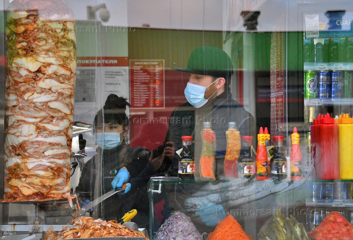 Views of Moscow. Genre photography. A man in a medical mask is cooking shawarma in a cafe on the territory of the Leningradsky railway station.