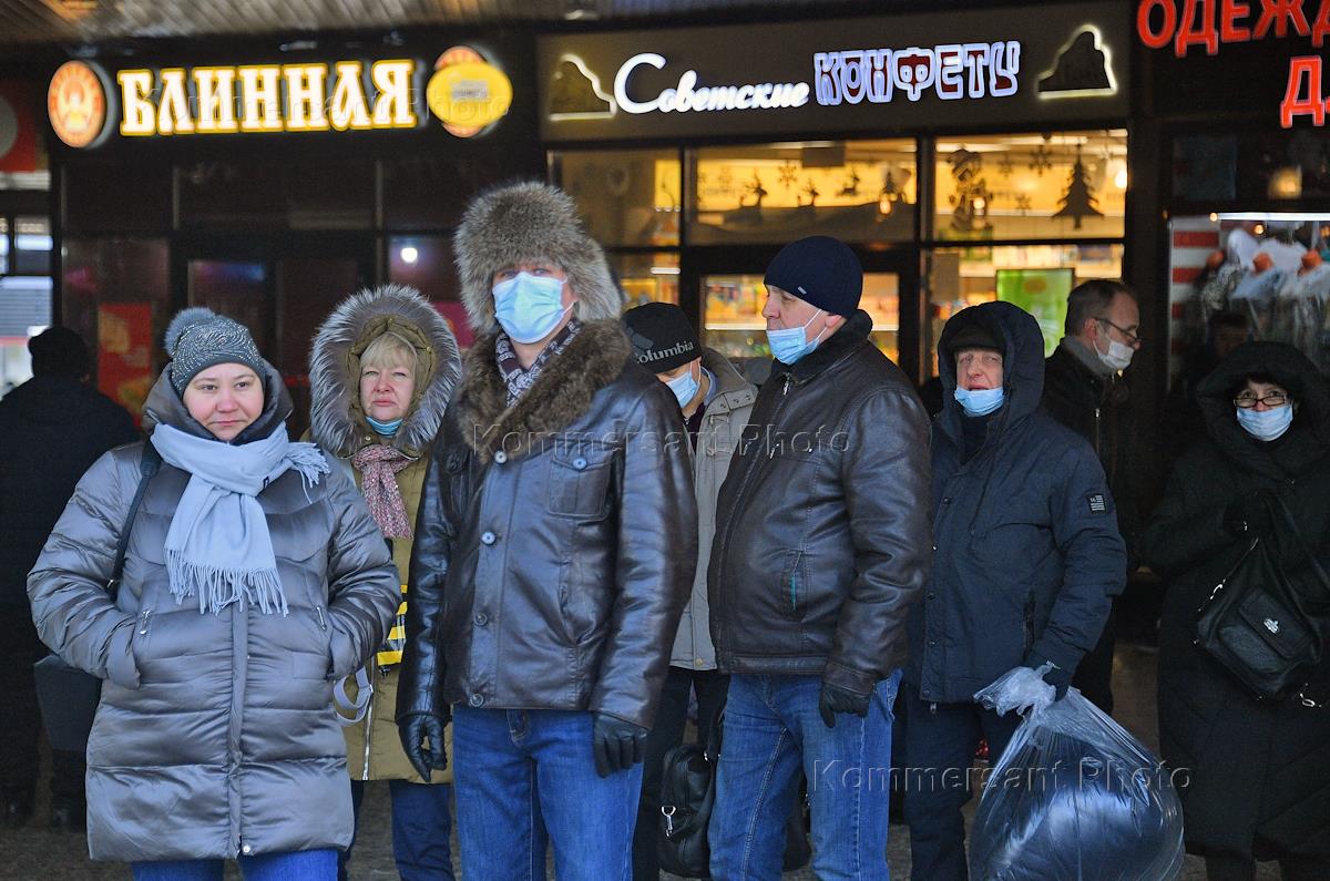Views of Moscow. Genre photography. Passengers in medical masks while waiting for the train at the Leningrad railway station.