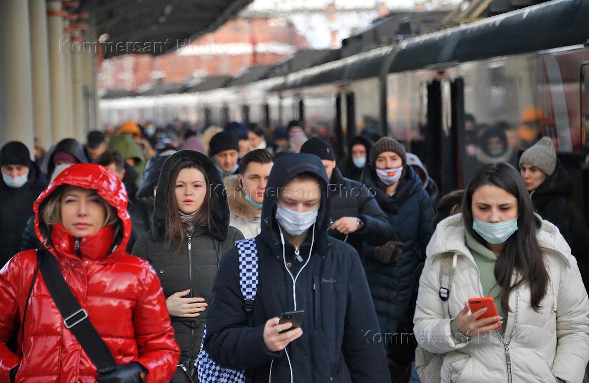 Виды Москвы. Жанровая фотография. Пассажиры в медицинских масках во время ожидания электрички на Ленинградском железнодорожном вокзале.