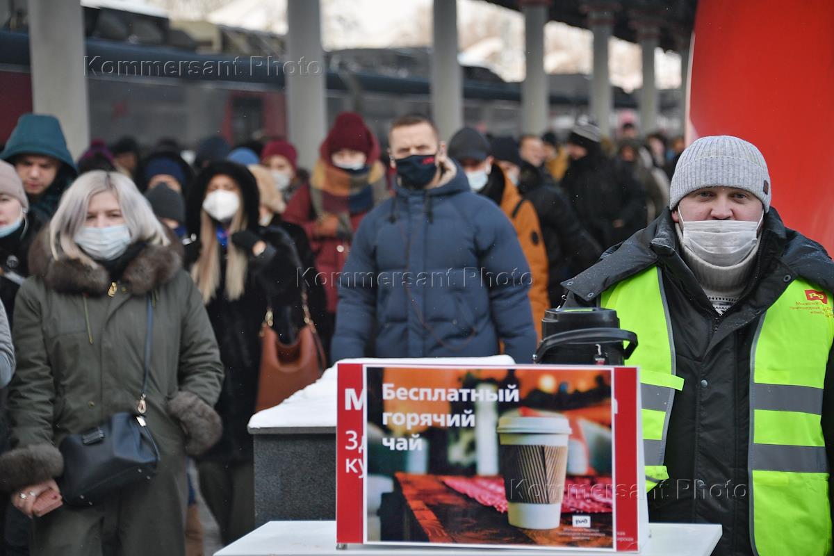 Views of Moscow. Genre photography. Employees of the Moscow-Tverskaya Suburban Passenger Company (PPK) during a free hot tea distribution to passengers at the Leningradsky railway station.