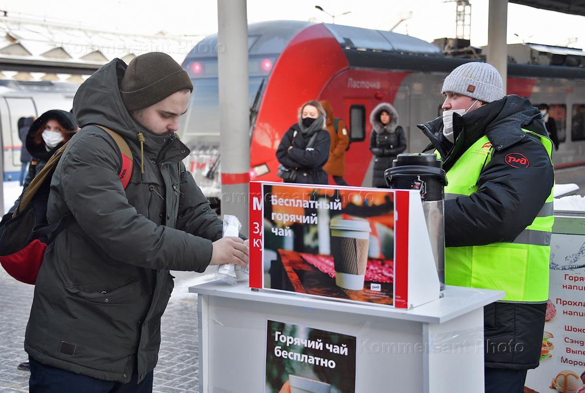 Виды Москвы. Жанровая фотография. Работники Московско-Тверской пригородной пассажирской компании (ППК) во время бесплатной раздачи горячего чая пассажирам на Ленинградском железнодорожном вокзале.