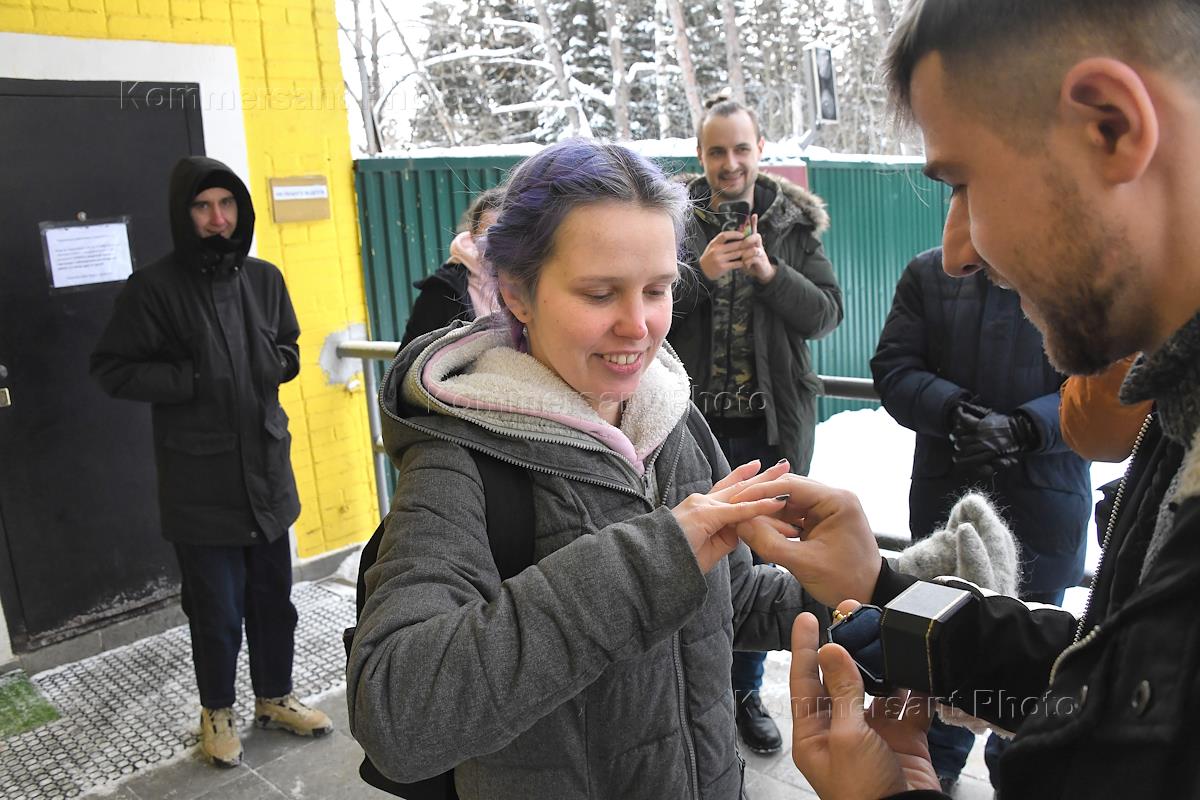 Освобождение задержанных участников несогласованных акций в поддержку оппозиционера Алексея Навального из ГБУ Многофункционального миграционного центра (спецприемник для мигрантов) в деревне Сахарово. Задержанная Яна Никифорова (в центре).