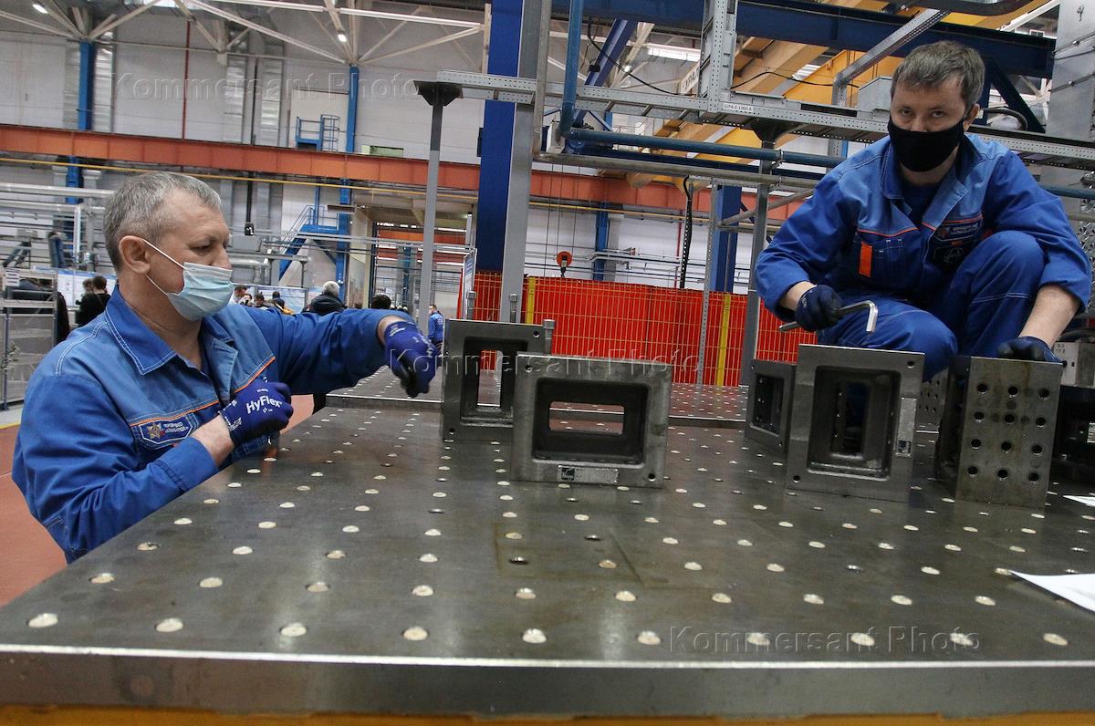 Выездное межотраслевое мероприятие "Использование научно-технического потенциала предприятий оборонно-промышленного комплекса в интересах нефтегазовой отрасли" с участием заместителя председателя Правительства России Юрия Борисова прошло на производственной площадке концерна ВКО "Алмаз-Антей". Рабочие пилотного проекта оборонной промышленности АО "Нижегородский завод 70-летия Победы" - нового завода "Концерна ВКО "Алмаз-Антей", во время работы.