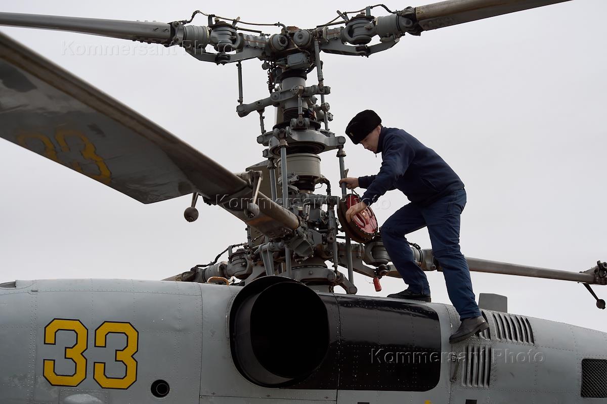 Экипажи вертолетов Морской авиации Черноморского флота провели тренировки по взлетам и посадкам на фрегат "Адмирал Макаров" в море. Командир поисково спасательного вертолета готовится к взлету.