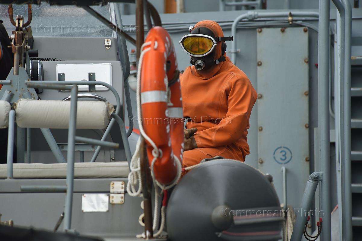 Экипажи вертолетов Морской авиации Черноморского флота провели тренировки по взлетам и посадкам на фрегат "Адмирал Макаров" в море. Командир поисково спасательного вертолета готовится к взлету.